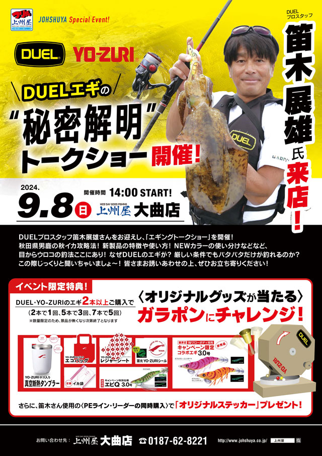 2024年9月8日(日)14:00~スタート(予定)、上州屋大曲店にDUELプロスタッフ、笛木展雄さんが来店!