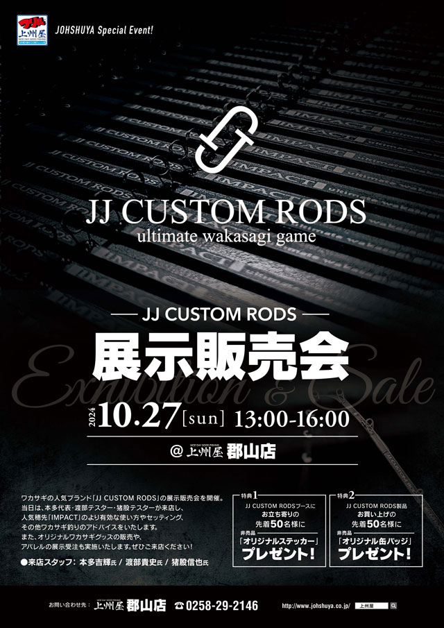 2024年10月27日(日)13:00~16:00、上州屋郡山店にてワカサギ人気ブランド「JJ CUSTOM RODS」の展示販売会を開催します!