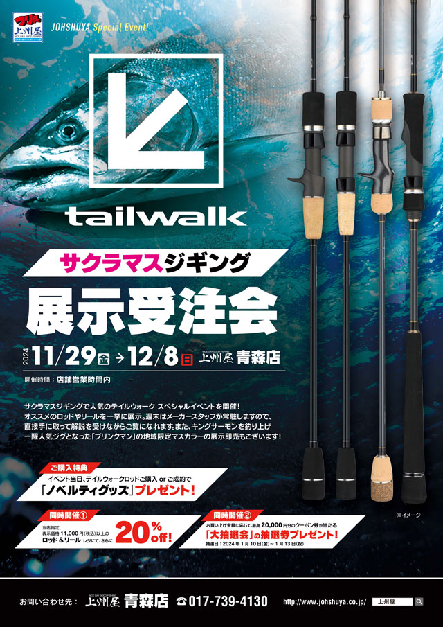 2024年11月29日(金)~12月8日(の10日間、上州屋青森店にてテイルウォーク“サクラマスジギングロッド”展示受注を開催します!