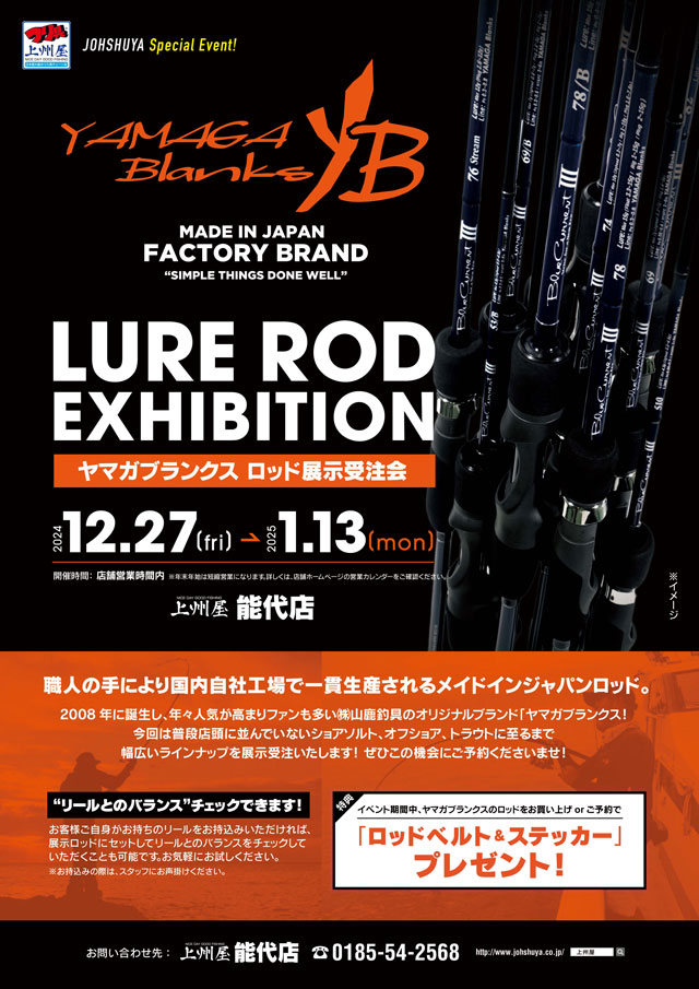 2024年12月27日(金)~2025年1月13日(月/の期間中、上州屋能代店にてヤマガブランクス社製、ルアーロッドの展示受注を開催します!