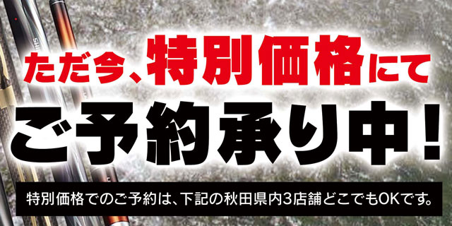 なお、只今秋田県内3店では上記展示会前にご予約頂いても【展示会特別価格&特典】にてお求め頂ける事前予約を承っております。年々確保が難しくなっている鮎竿&鮎用品、気になる製品のある方は早めのご相談を各店にてお待ちしております!