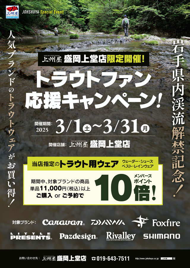 期間中、上州屋盛岡上堂店にてウェーダー、シューズ、ベスト、レインウェアetc.当店指定、単品11,000円(税込)以上のトラウト用ウェア(対象ブランド商品)をご購入またはお買い上げでメンバーズポイント10倍!