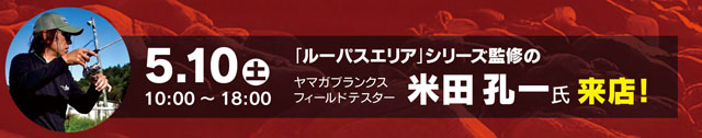なお5月10日(土)10:00~18:00の時間帯には、ヤマガブランクス「ルーパスエリア」シリーズを監修した、米田孔一テスターが来店!開発秘話や自分にあったモデルの選び方etc.色々聞くことが出来ますので、この機会をお見逃しなく!