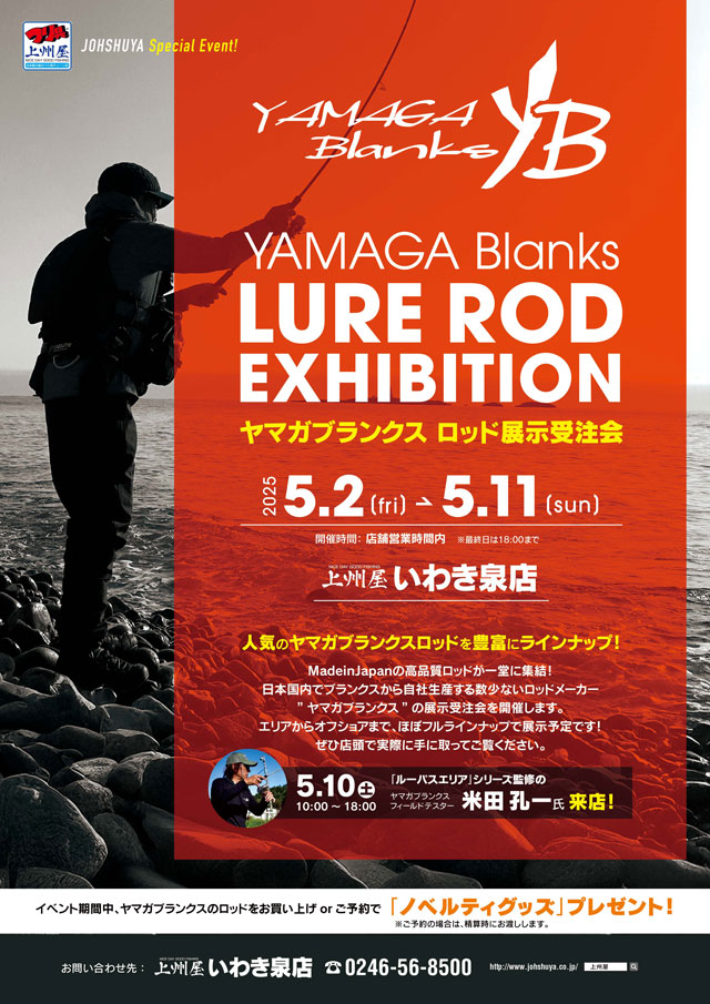 2025年5月2日(金)~11日(日)の10日間、上州屋いわき泉店にてヤマガブランクス社製、ルアーロッドの展示受注会を開催します!
