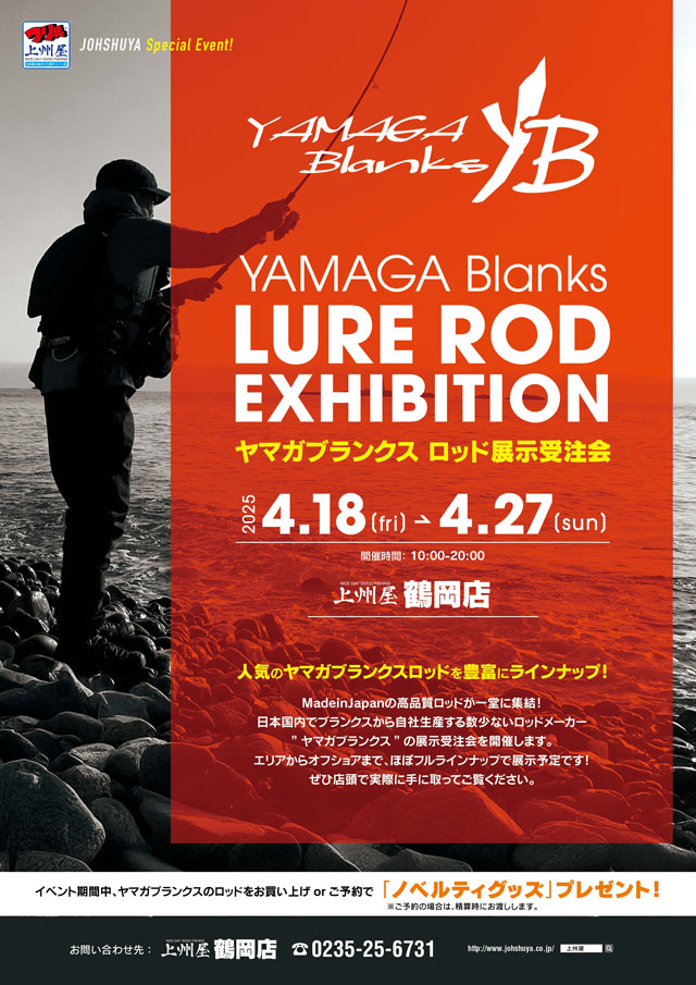 2025年4月18日(金)~27日(日)の10日間、上州屋鶴岡にてヤマガブランクス、ルアーロッドの展示受注会を開催します!