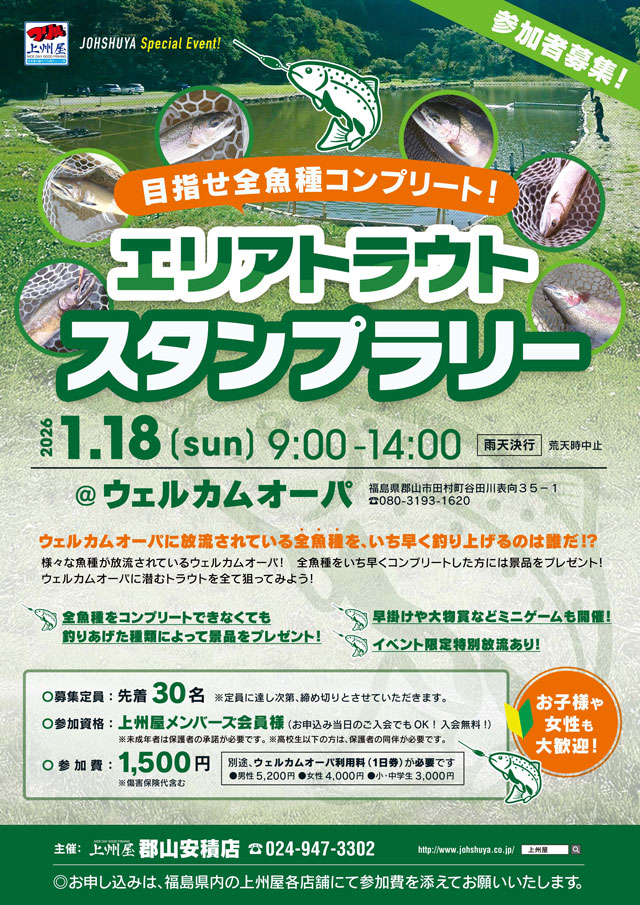 2026年1月18日(日)9:00~14:00予定、福島県郡山市の管理釣り場「ウェルカムオーパ」にて「目指せ全魚種コンプリート!エリアトラウト・スタンプラリー in ウェルカム・オーパ」を開催します!