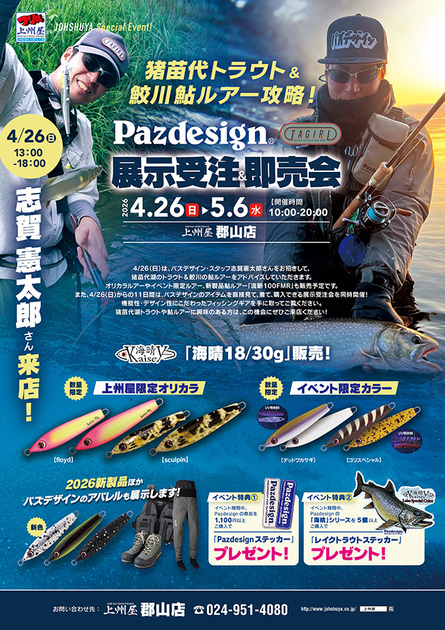 2026年4月26日(日)~5月6日(水・祝)の期間中、上州屋郡山店にて猪苗代トラウト&鮫川鮎ルアー攻略!Pazdesign(パズデザイン)展示受注会を開催します!