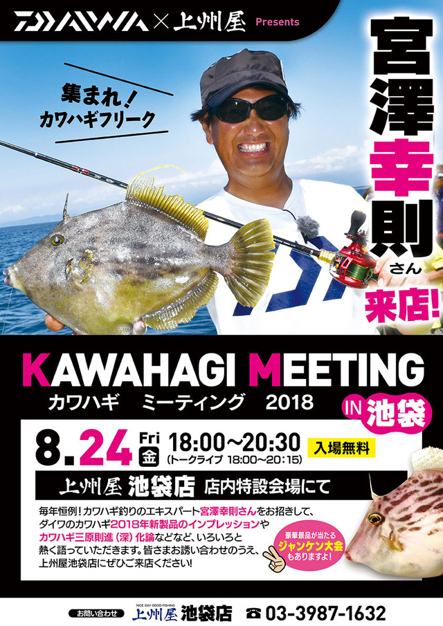 2018年8月24日(金)18:00~20:30、上州屋池袋店にカワハギ釣りのエキスパート宮澤幸則さんが来店!カワハギミーティング2018開催します!DAIWAカワハギ2018年新製品のインプレッションや、カワハギ三原則 進(深)化論などなど、熱く語って頂きますのでお楽しみに!