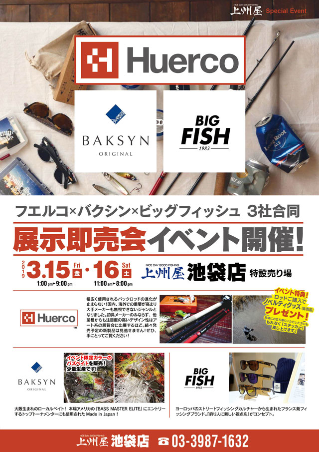 2019年3月15日(金)13:00~21:00および翌3月16日(11:00~20:00、上州屋池袋店内特設コーナーにてフエルコ×バクシン×ビッグフィッシュ3社合同展示即売会開催いたします!
