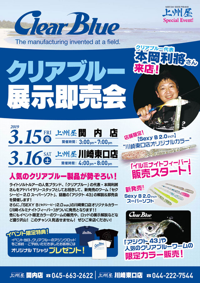 ライトソルトルアーの人気ブランド「クリアブルー」の代表・本岡利將さんをアドバイザリースタッフとしてお招きして、新発売のワーム「セクシービー2.0スーパーソフト」および話題のアジング専用プラグ「アジクト43」の解説&即売会を開催します!