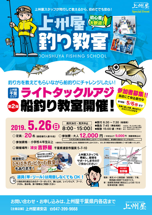 ※釣り教室当日、現地での参加お申し込み受付は出来ません※荒天等により釣り教室開催不能と決定した場合は、前日の午後6:00~8:00の間に参加者の方に電話にてお知らせいたします。※天候、水温、釣況等の理由により開催見合わせとなる場合がございます。※キャンセルによる参加費の返金をご希望される場合は、2019年5月5日(日)までにお申込みの上州屋グループ各店舗へご連絡をお願いします。それ以降のキャンセル料のお支払いは出来ませんので予めご了承下さい。
