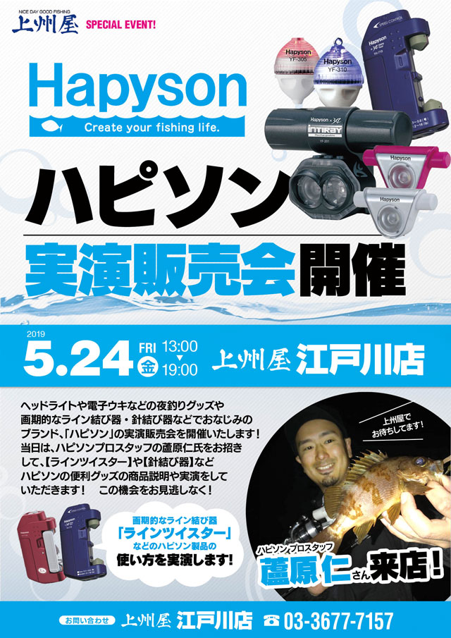 2019年5月24日(金)13:00~19:00、上州屋江戸川店にて、ヘッドライトや電子ウキなどの夜釣りグッズ、画期的な針結び器などで有名なHapysonハピソンの実演販売会を開催します!