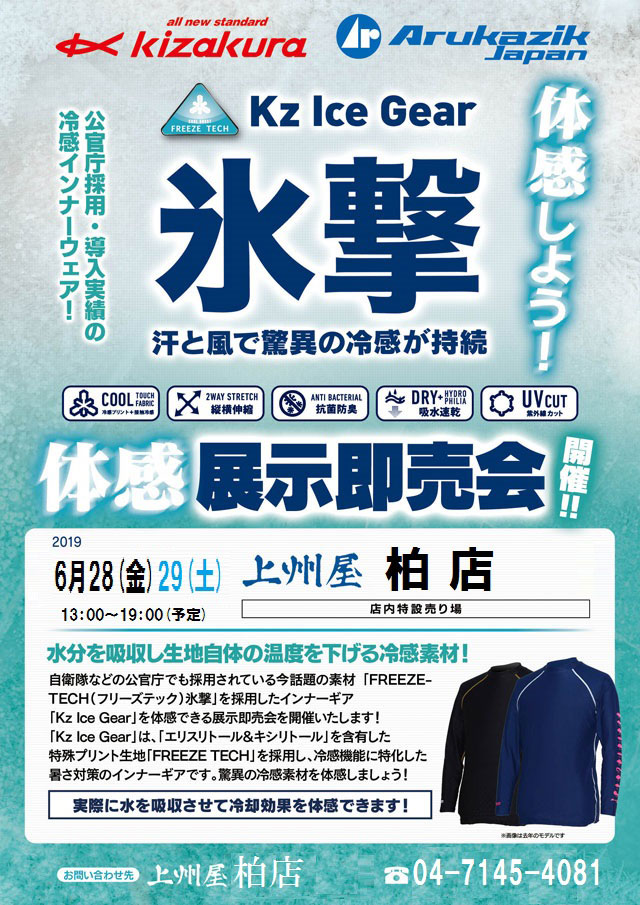 2019年6月28日(金)13:00~19:00(予定)および6月29日(13:00~19:00(予定)の2日間、上州屋柏店にて水分を吸収し生地自体の温度を下げる今話題の冷感素材「FREEZE TECH(フリーズテック)氷撃」を採用したインナーギア「Kz Ice Gear」の展示即売会を開催します!自衛隊など官公庁採用・導入実績の話題の冷感インナーウェアを体感してみましょう!