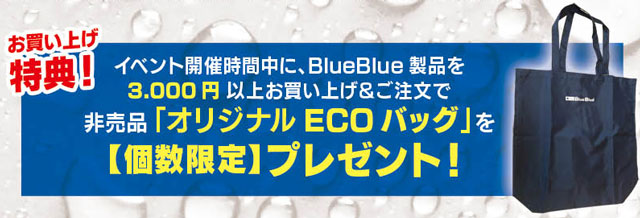 イベント開催中にBlueBlue対象製品を3,000円以上お買い上げもしくはご注文頂いた方に非売品「オリジナルエコバック」を数量限定プレゼント!