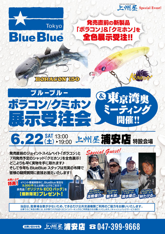 2019年6月22日(土)13:00~19:00(予定)上州屋浦安店にて近日発売予定の注目ルアー“ボラコン”“クホミン”の展示受注会を開催!当日は湾奥シーバスの攻略からオフショアまで各ジャンルに精通したBlueBlueスタッフが多数来店して「東京湾奥ミーティング」を同時開催いたします!