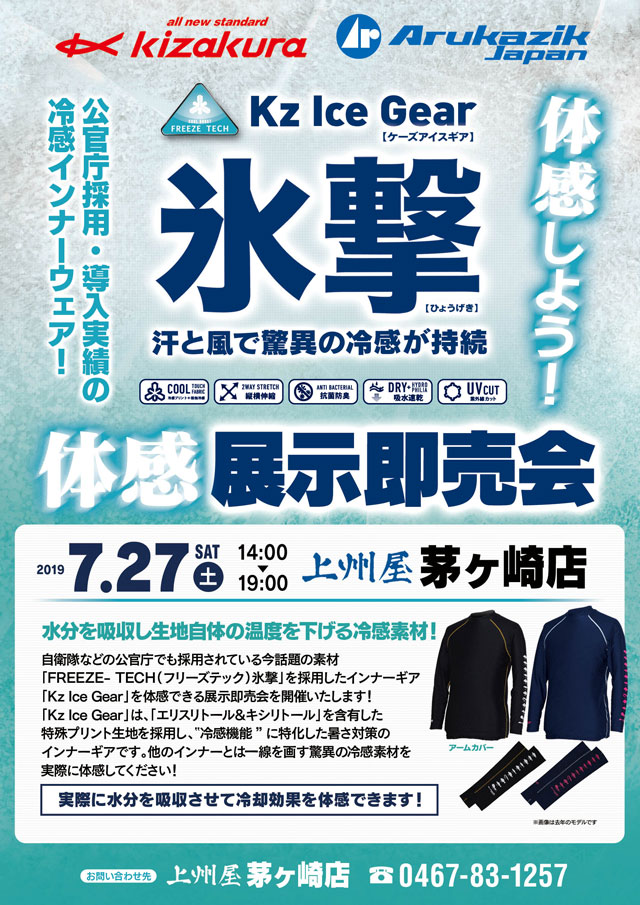 2019年7月27日(土)14:00~19:00(予定)、上州屋茅ヶ崎店にて水分を吸収し生地自体の温度を下げる今話題の冷感素材「FREEZE TECH(フリーズテック)氷撃」を採用したインナーギア「Kz Ice Gear」の展示即売会を開催します!自衛隊など官公庁採用・導入実績の話題の冷感インナーウェアを体感してみましょう!
