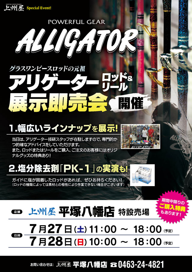 上州屋平塚八幡店にてグラスワンピースロッドの元祖、アリゲーターロッドの展示即売会を開催します!
