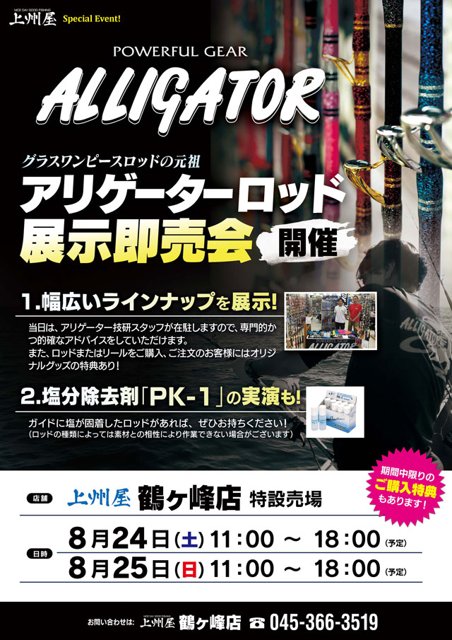 上州屋鶴ヶ峰店にてグラスワンピースロッドの元祖、アリゲーターロッドの展示即売会を開催します!