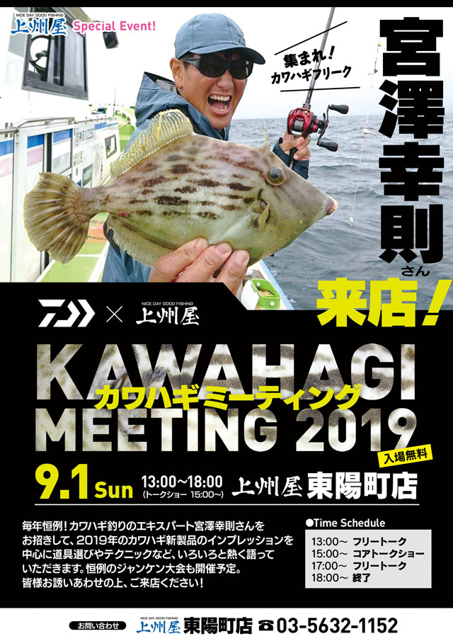 2019年9月1日(日)13:00~18:00、上州屋東陽町店にカワハギ釣りのエキスパート宮澤幸則さんが来店!カワハギミーティング2019開催します!DAIWAカワハギ2019年新製品のインプレッションを中心に、それぞれの釣法に適した道具選びや、注目の最新テクニックなど色々熱く語っていただきます!