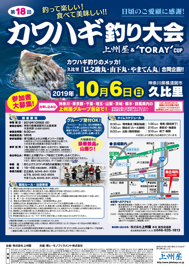 2019年10月6日(日)、神奈川県横須賀市、久比里長瀬にて「第18回カワハギ釣り大会上州屋&TORAYカップ」を開催します!カワハギ釣りのメッカ、久比里「巳之助丸、山下丸、やまてん丸」合同企画!テクニカルな釣趣が人気!釣って楽しく食べて美味しいカワハギ釣りは毎年大変人気の釣りモノです。お申し込みはお早めに!