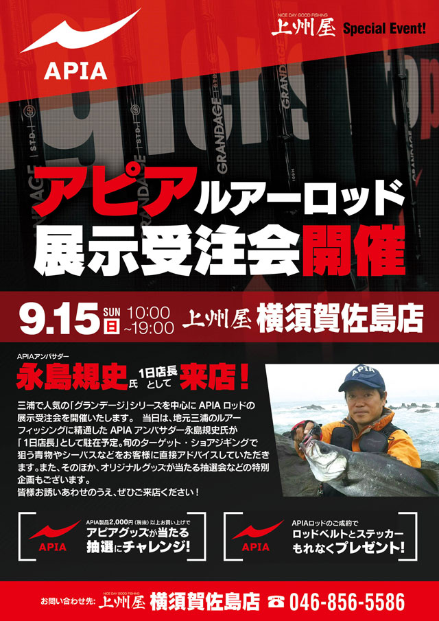 2019年9月15日(日)10:00~19:00(予定)、上州屋横須賀佐島店にAPIAアンバサダー永島規史さんが1日店長として来店!三浦で人気の“グランデージ”シリーズを中心にアピアロッドの展示受注会を開催します!