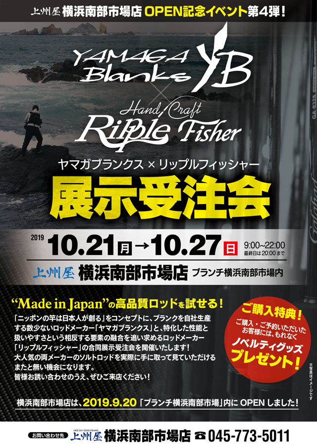 2019年10月21日(月)~27日(日)の間、上州屋横浜南部市場店にてヤマガブランクス×リップルフィッシャー合同展示受注会を開催します!(開催時間は店舗営業時間に準じますが、最終日は20:00終了となります)