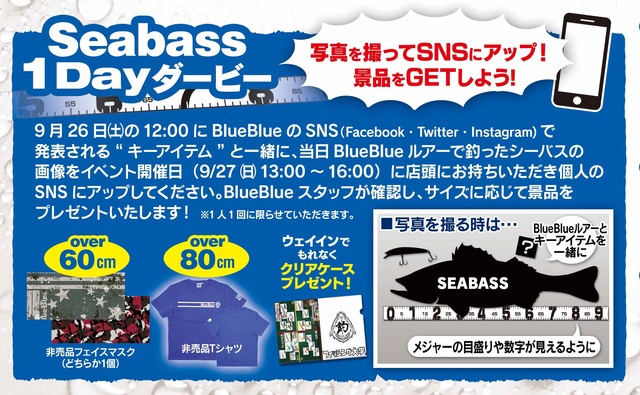 サブイベントとして今年はBlueBlueシーバス1Dayダービーを開催!イベント前日の9月26日(土)12:00、BlueBlueのSNS(下記参照)にて“キーアイテム”が発表されます!当日BlueBlueルアーで釣ったシーバスにメジャーをあててこの“キーアイテム”と一緒に撮影し、店頭イベントが開催される9月27日(日)13:00~16:00の間に店頭にお持ちいただき、個人のSNSにアップしてください!