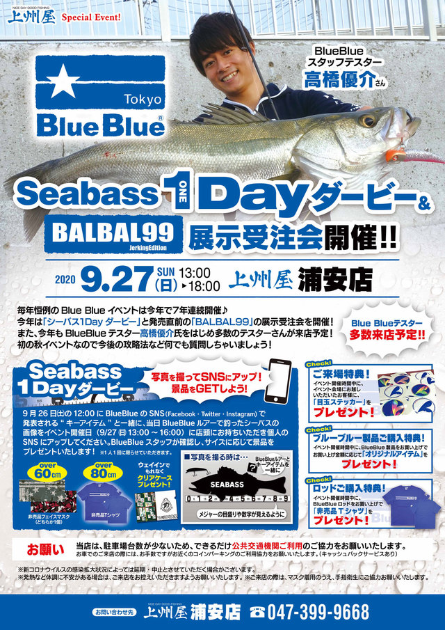 2020年9月27日(日)13:00~18:00、上州屋浦安店にて毎年恒例!BlueBlueブルーブルーのシーバスイベントを開催!BlueBlueブルーブルーのスタッフテスター高橋優介さんと吉澤竜郎さんが来店し、注目の新製品ロッド“BALBAL99”の展示受注会を開催します!