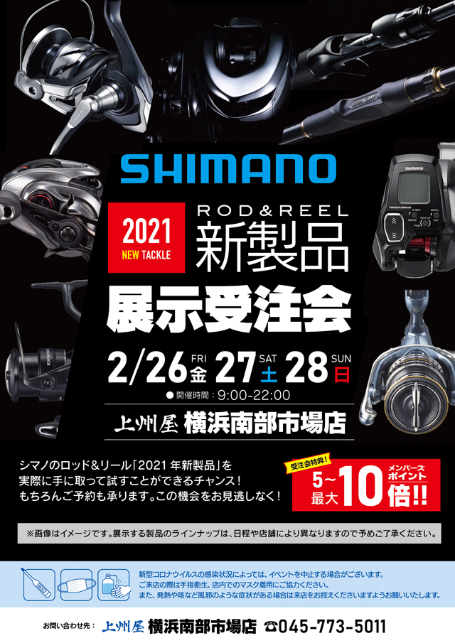 2021年2月26日(金)、27日(土)、28日(日)の3日間(開催時間全日9:00~22:00)、上州屋横浜南部市場店にてシマノ2021年ロッド&リール新製品展示受注会を開催します!