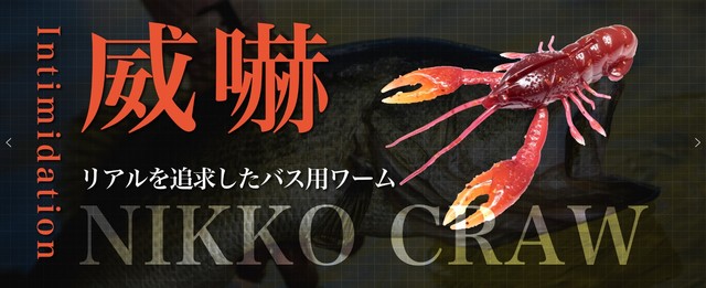 リアルを追求したバス用ワームNIKKO CRAW(ニッコークロー)。全体のシルエットは外敵に脅されているザリガニをイメージ。腹部や甲羅の角度、ハサミの広がり幅、テールはザリガニが「危ない!」と危険を感じたときのポーズになるよう設計。またテールフィンを付けることにより巻いた時に回転せず逃げる姿勢を守って泳げる。