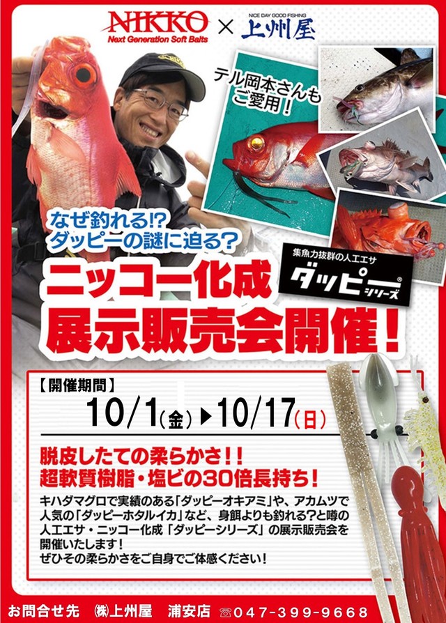 2021年10月1日(金)~17日(日)上州屋浦安店にて生エサより釣れると評判の人口エサ、ニッコー化成「軟質疑似餌シリーズ」展示販売会を開催します!