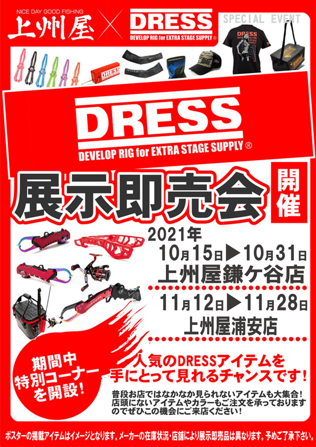 2021年11月12日(金)~28日(の間、上州屋浦安店にてDRESS|ドレス、フィッシングギアの展示即売会を開催します!