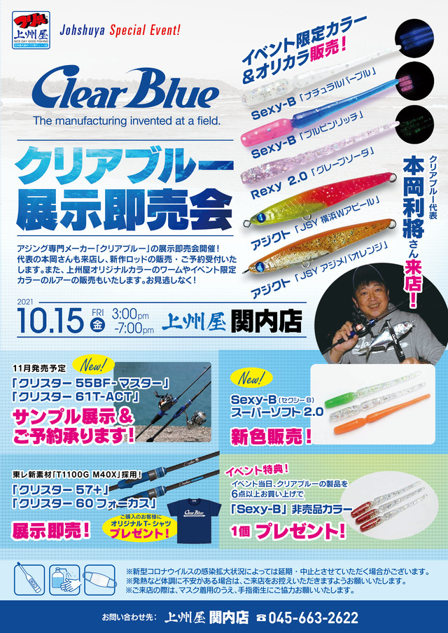アジングをはじめとしたライトソルトルアーの人気ブランド“クリアブルー”の代表、本岡利將さんが来店予定!新作ロッドの販売・予約受付や、上州屋オリジナルカラーのルアー、イベント限定カラーのルアー販売もいたします!