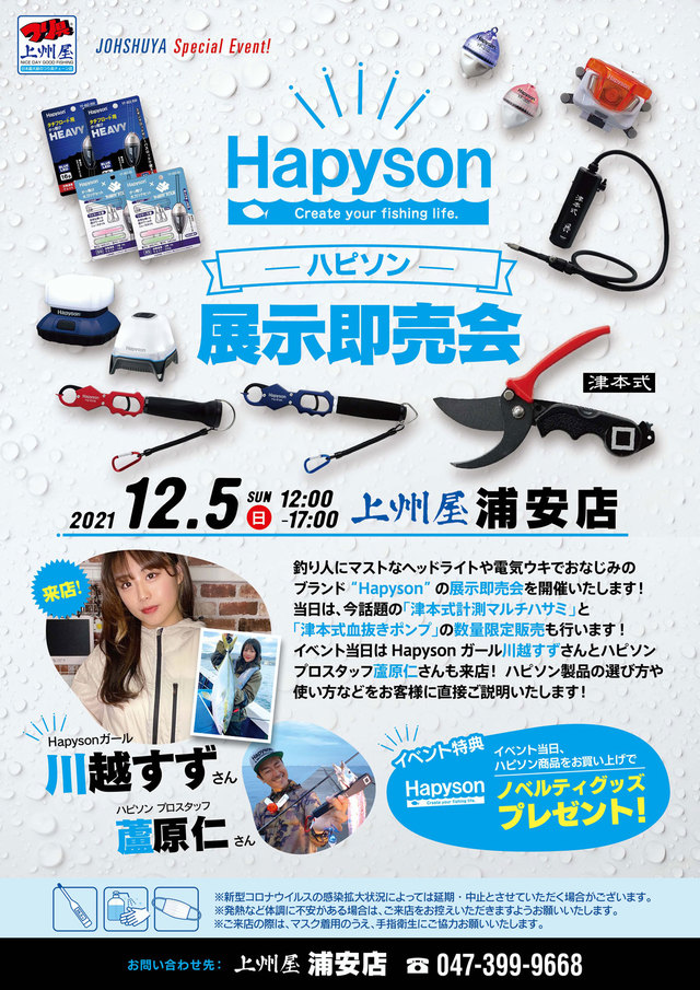 2021年12月5日(12:00~17:00、上州屋浦安店にて、ヘッドライトや電子ウキなどでお馴染み、Hapysonハピソンの展示即売会を開催します!