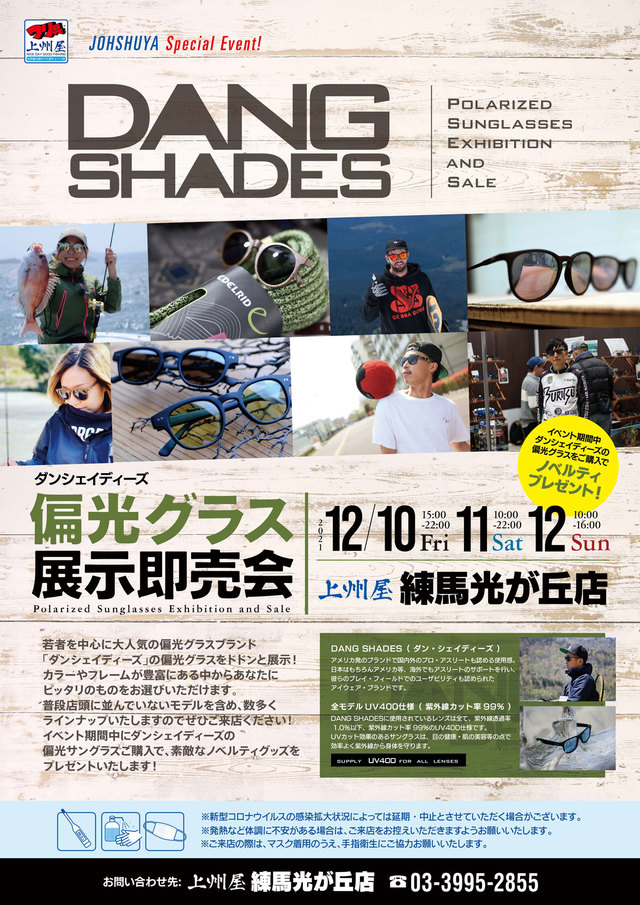 の3日間、上州屋練馬光が丘店にてDANG SHADES(ダン・シェイディーズ)偏光グラスの展示販売会を開催します!