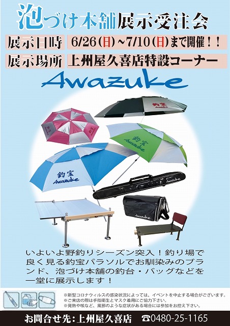2022年6月26日(日)~7月10日(日)の15日間、上州屋久喜店にて泡づけ本舗“へら鮒用品”の展示受注会を開催します。