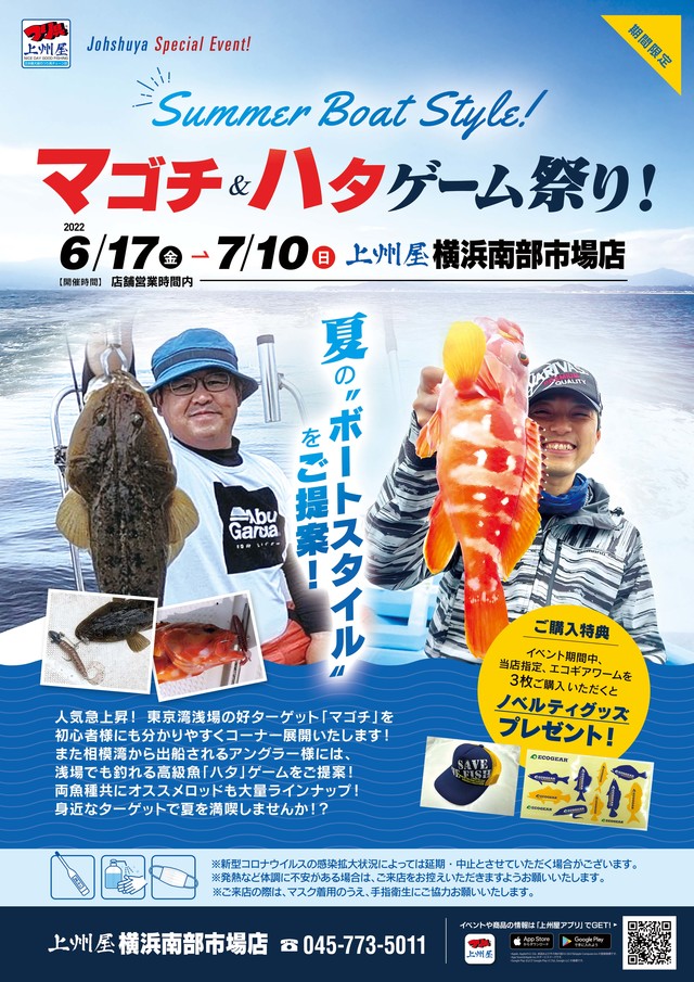 2022年6月17日(金)~7月10日(日)の期間中、上州屋横浜南部市場店にてボートスタイル!沖から狙う夏の「マゴチ&ハタゲーム祭り」店頭イベントを開催いたします!
