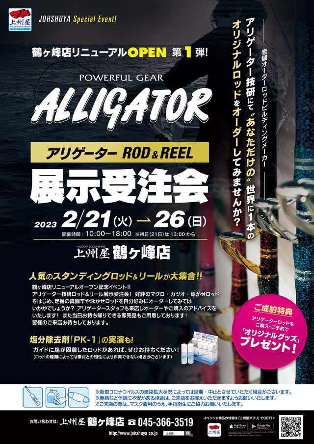 2023年2月21日(火)~26日(日)の6日間、上州屋鶴ヶ峰店にてグラスワンピースロッドの元祖、アリゲーターROD&REELの展示受注会を開催します!(※開催時間は初日21日のみ13:00~18:00、その後26日までの期間中は各日10:00~18:00となります)