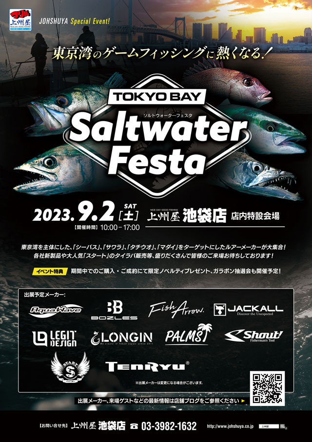 2023年9月2日(土)10:00~17:00、東京湾のゲームフィッシングに熱くなる!TOKYO BAY ソルトウォーターフェスタを上州屋池袋店、店内特設会場にて開催します!