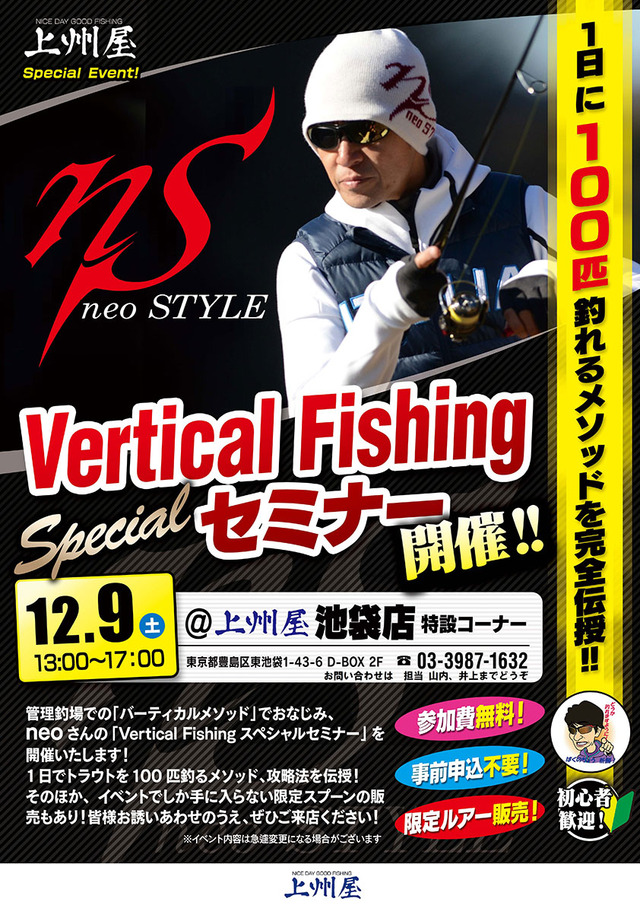 常識を覆し、独自のneo理論に基づく「縦釣り:バーチカルスタイル」により全国の管理釣り場で爆音ドラグをかき鳴らすスーパーアングラー、neo氏がやって来る!!