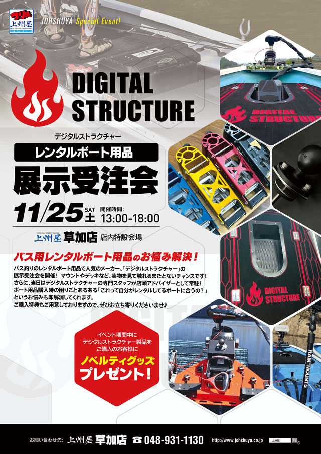 草加店店長やスタッフも愛用するDSショートマウントはもちろん、デジタルストラクチャー製品が勢ぞろい!!レンタルボートユーザー必見のイベントです!