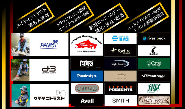 トラウト界の著名人も多数来店予定!パームス社より飯田重祐氏、風間俊春氏、D-3社より福士和之氏、クマタニトラスト社より熊谷隆志氏、ティムコ社より田崎翔氏、パズデザイン社より近年中禅寺湖で実績を上げているプロスタッフ志賀憲太郎氏、これだけの豪華著名人が一堂に揃うイベントはそうそうありません!
