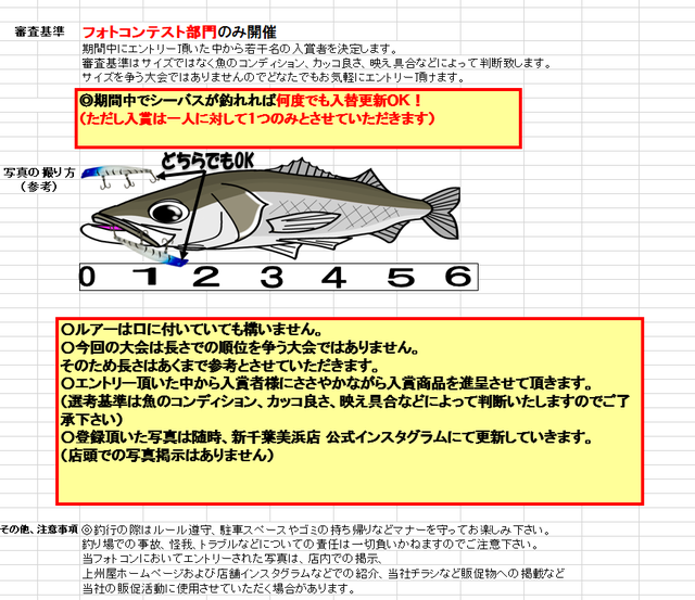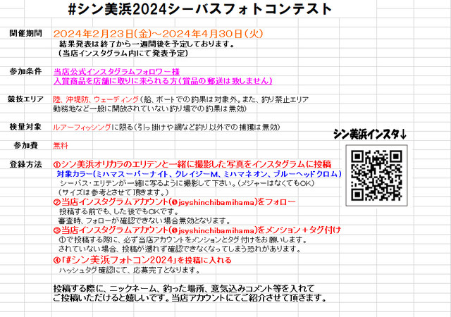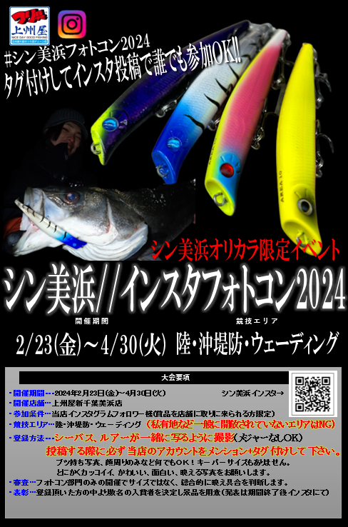 2024年2月23日(金)~4月30日(火)の期間中、上州屋新千葉美浜店にて「シン美浜インスタフォトコン2024」を開催!当店オリカラの“エリテン”でシーバスを釣って、Instagram(インスタグラム)に映える写真を投稿しよう!!