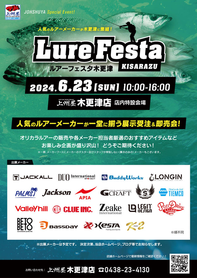 2024年6月23日(日)10:00~16:00、上州屋木更津店にて人気ルアーメーカーが一堂に揃う展示受注&即売会「ルアーフェスタ木更津」を店頭開催します!