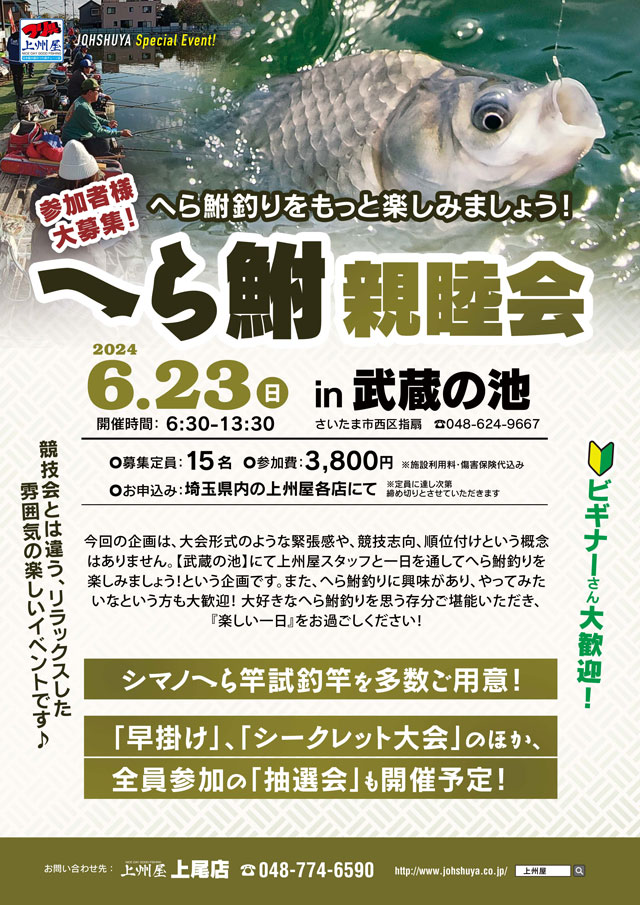 2024年6月23日(、埼玉県さいたま市、武蔵の池にて上州屋、へら鮒親睦会&試釣イベントを開催します!SHIMANO(シマノ)へら竿を試釣用に多数ご用意!