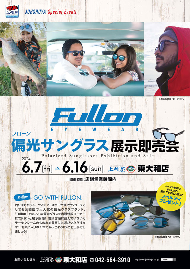 2024年6月7日(金)~16日(日)の10日間、上州屋アウトドアワールド東大和店にてFullon(フローン)偏光グラスの展示即売会を開催します!