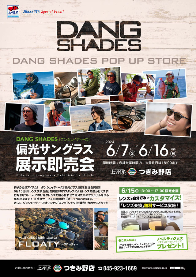 2024年6月7日(金)~16日(日)の10日間、上州屋アウトドアワールドつきみ野店にてDANG SHADES(ダン・シェイディーズ)偏光グラスの展示即売会を開催します!