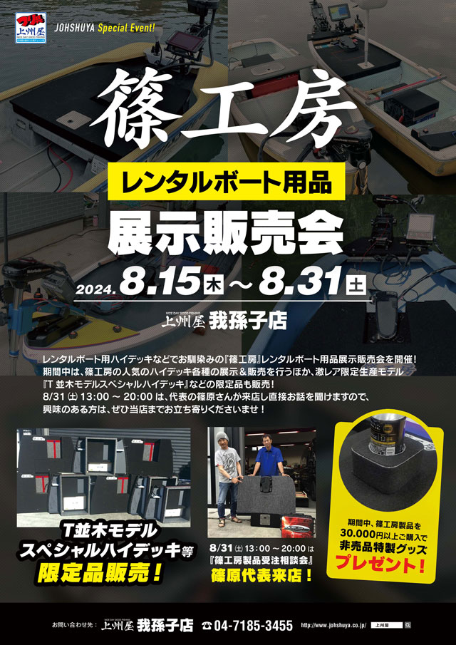 2024年8月15日(木)~8月31日(土)の期間中、上州屋我孫子店にてバス用レンタルボートのハイデッキでお馴染み『篠工房』レンタルボート用品の展示販売会を開催します!