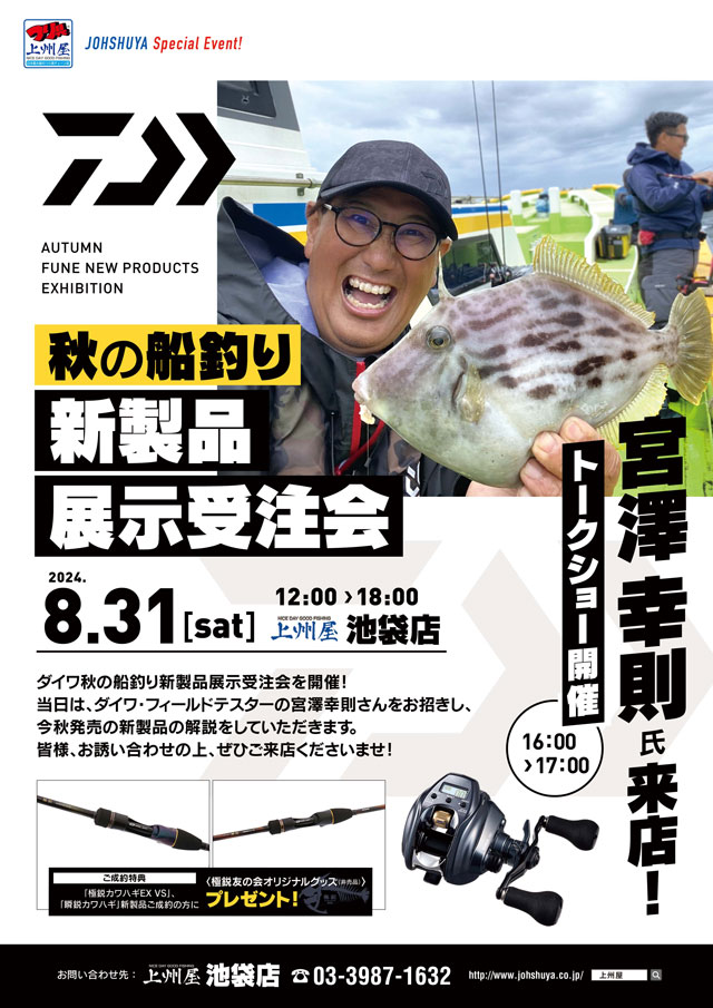 2024年8月31日(土)12:00~18:00、上州屋池袋店にDAIWAフィールドテスターの宮澤幸則さんが来店!DAIWAカワハギ竿や船用品など、様々なDAIWA秋の新製品を一堂に展示します!
