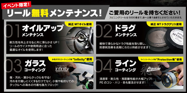 当日お手持ちのリール(※)をお持ちいただければ高性能M.T.C.W.製品を使用した体験無料メンテナンスをサービスさせていただきます!この機会にどうぞM.T.C.W.製品の性能を体感ください!また日頃のリールメンテナンスに関するお悩み相談など、幅広く承ります!